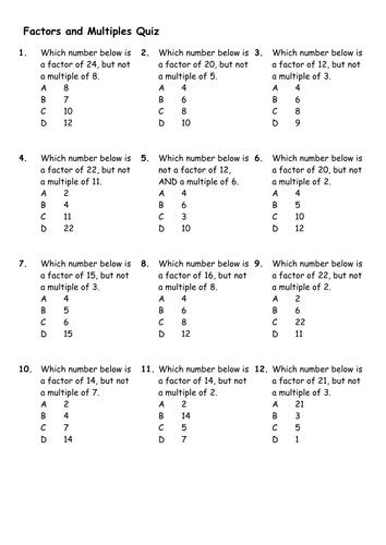 Factors And Multiples Worksheet Teaching Resources | TPT 18 worksheets (plus answer key) related to factors and multiples.8 factors worksheets, including:- Finding factor pairs; listing factors of a number- Choosing factors of a given number out of a mixed number grid- Determining common factors of 2 or 3 numbers- Classifying numbers as prime or composite- Multiple choice (including multi-select)7 ...